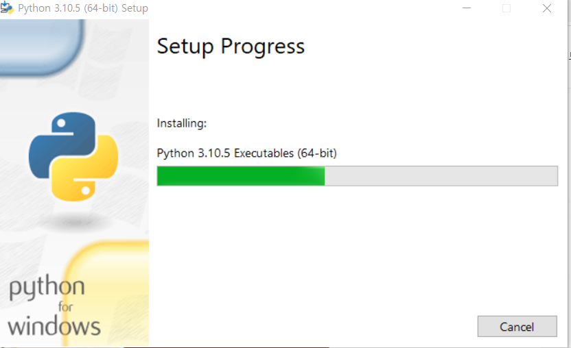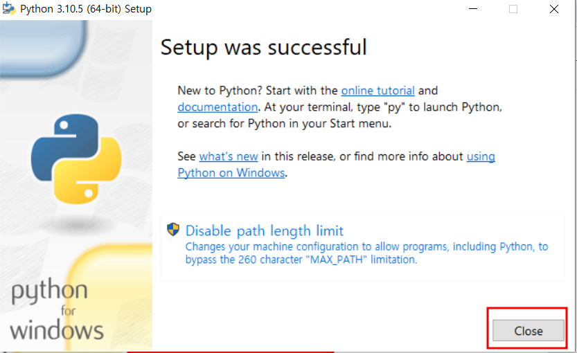 3. 파이썬 설치 진행화면이 나오고 완료가 되면 Setup was successful 화면이 나오면 Close를 누른다. 파이썬 설치가 완료된다.